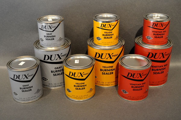 The Dux Burnish Sealers are oil based pigmented primers that eliminate the requirement for separate applications of a sealer or bole. They produce a smooth surface requiring no or very light sanding. Burnish sealers are available in yellow, red, and gray. They can be intermixed to create varying effects with gold, silver and copper leaf. Due to its unique formulation, the burnish sealers can be used on many substrates such as wood, plaster, metal and composition surfaces. It will seal the surface, provide excellent adhesion and permit an easy high burnish with a minimum of rubbing.