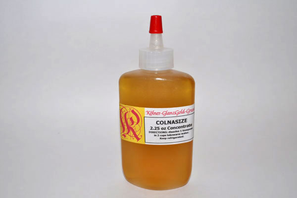Colnasize Concentrate: An easily prepared size/adhesive for the adhesion of gold and silver leaf to Kolner Insta-Clay and Burnishing Clays. Dissolve one measured teaspoon in two cups of luke-warm tap water to make gilder's liquor.